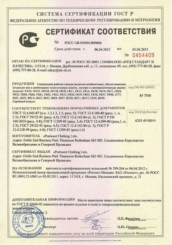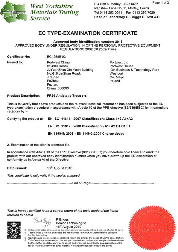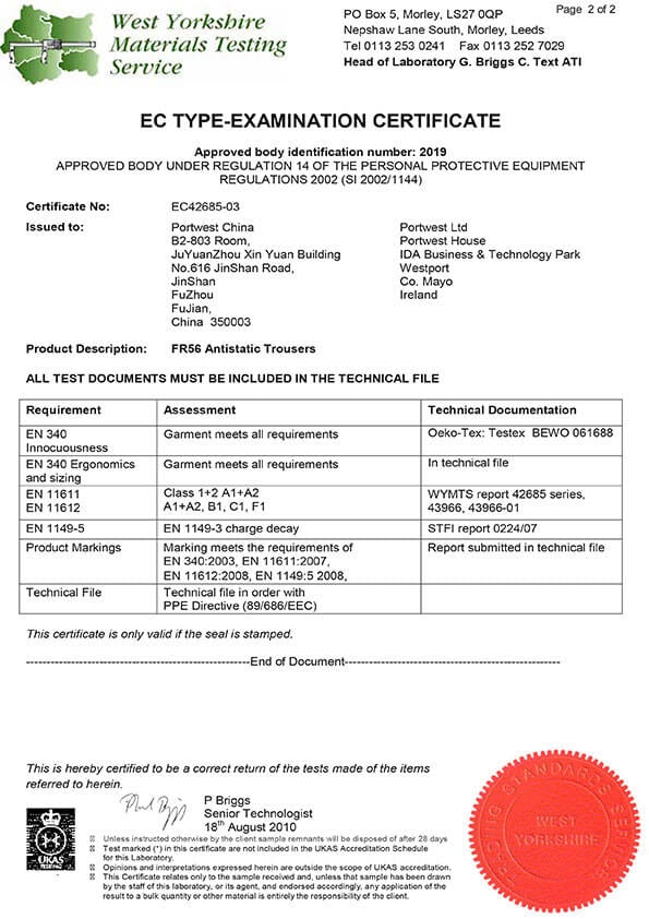 Normen: EN ISO 11612 A1+A2, B1, C1, E2, F1, EN ISO 11611 Klasse 2 A1+A2, EN 1149 -5, IEC 61482-2 IEC 61482-1-1 Elim 8.6 CAL/CM², IEC 61482-2 IEC 61482-1-2 APC 1, ASTM F1959/F1959M-12 ATPV=13.6 Cal/CM2 (HAF=82%)